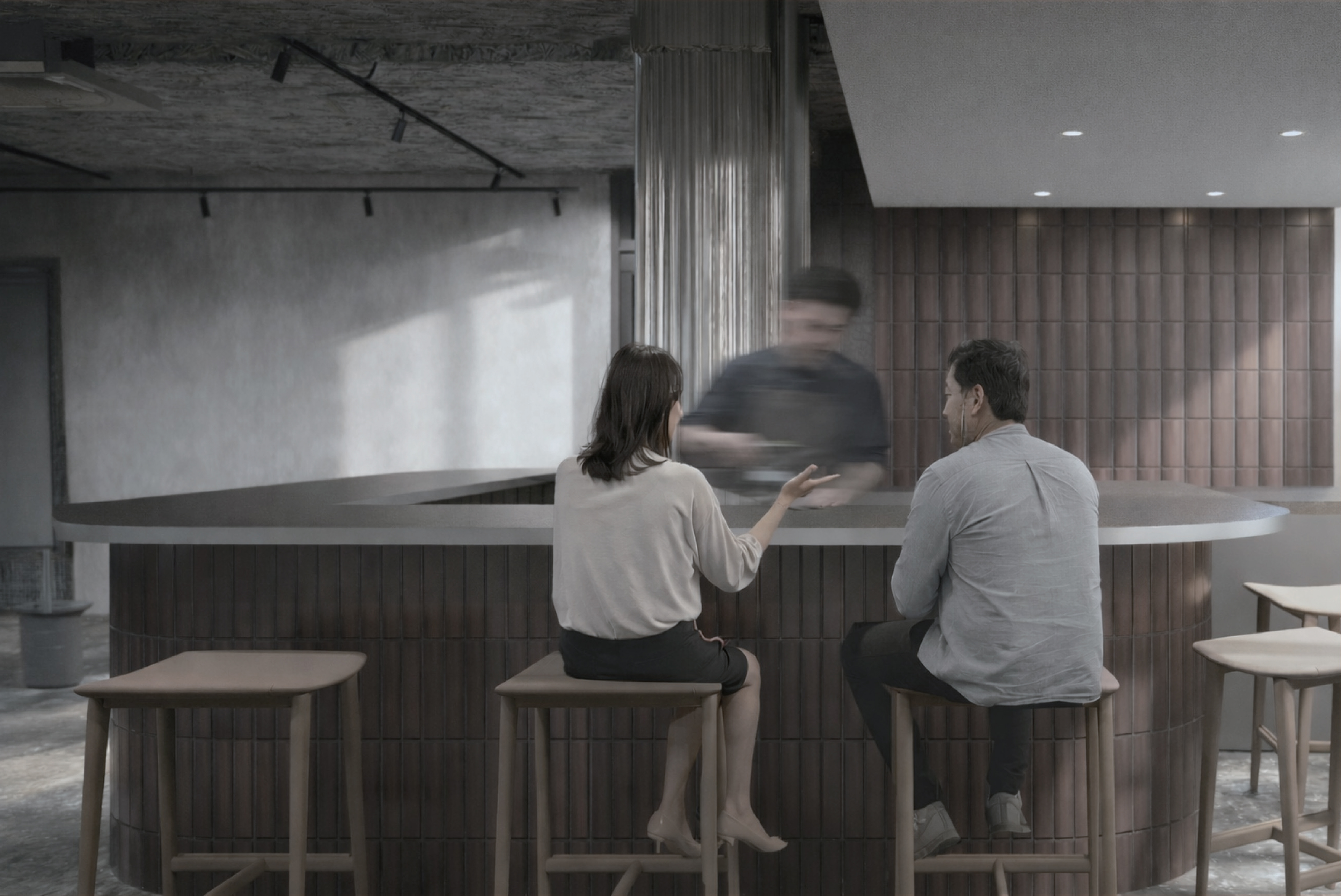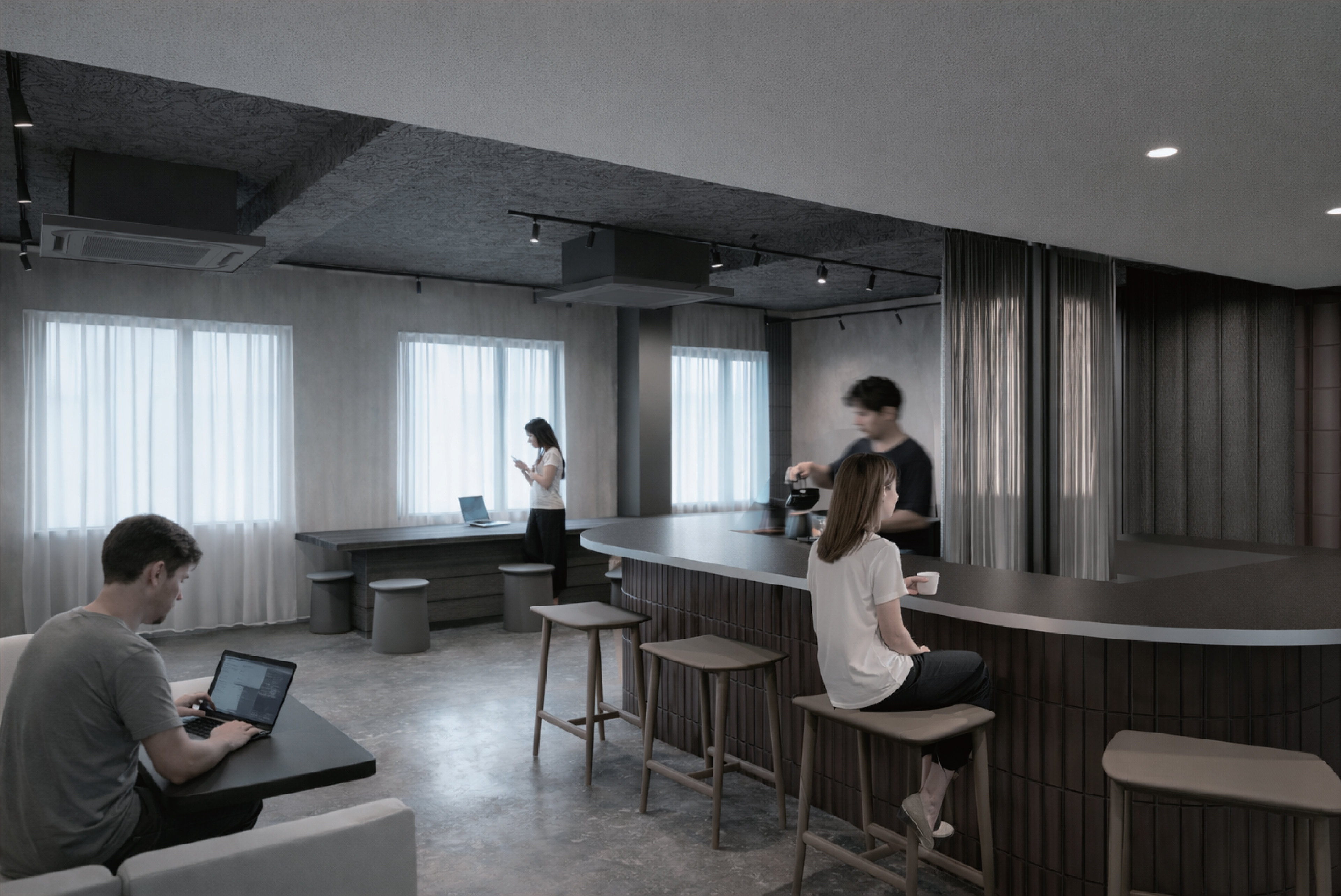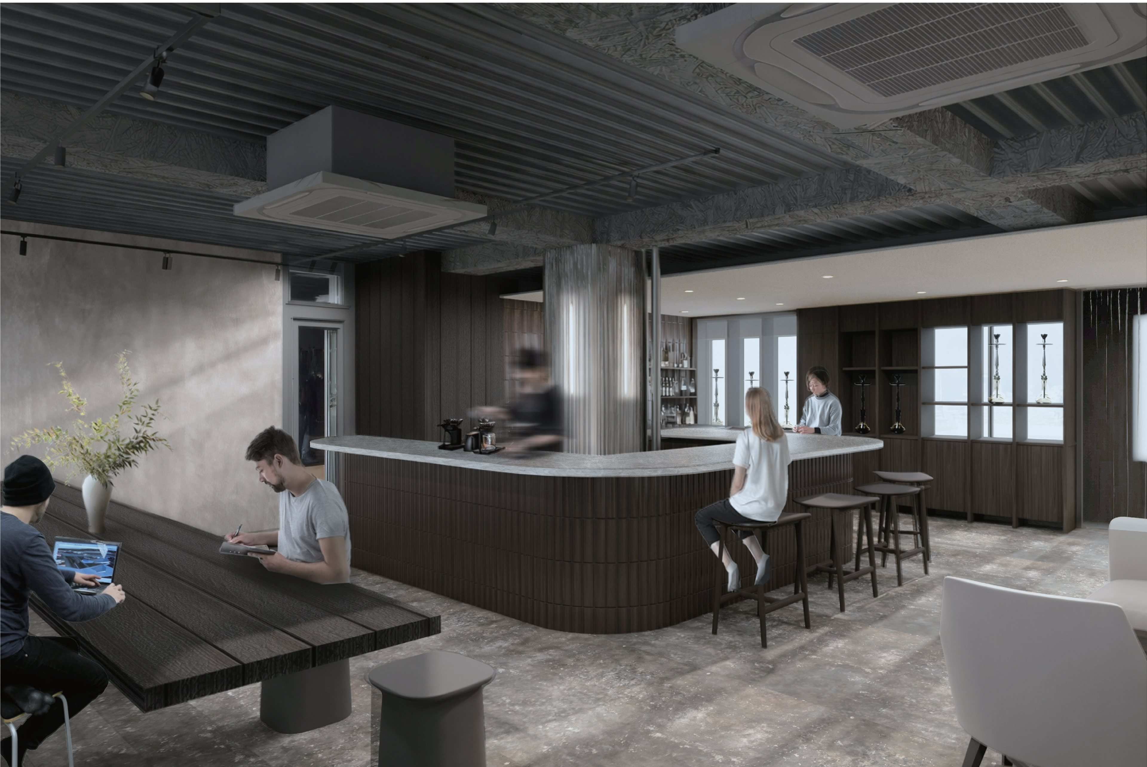 カフェ兼シーシャバーの内装計画。区画中央でも端でもない位置に立つ柱を核にカウンターを円環状に配置し、外側へ長テーブルやボックス席を展開。距離によって関係の密度が変わる平面とした。透過性のカーテンと低い色温度の光で中心に揺らぎをつくり、場の重心を明確にする。スタッフがその中心でオペレーションすることで、振る舞いが秩序を生み、場は自律的に整っていくような空間をつくった。