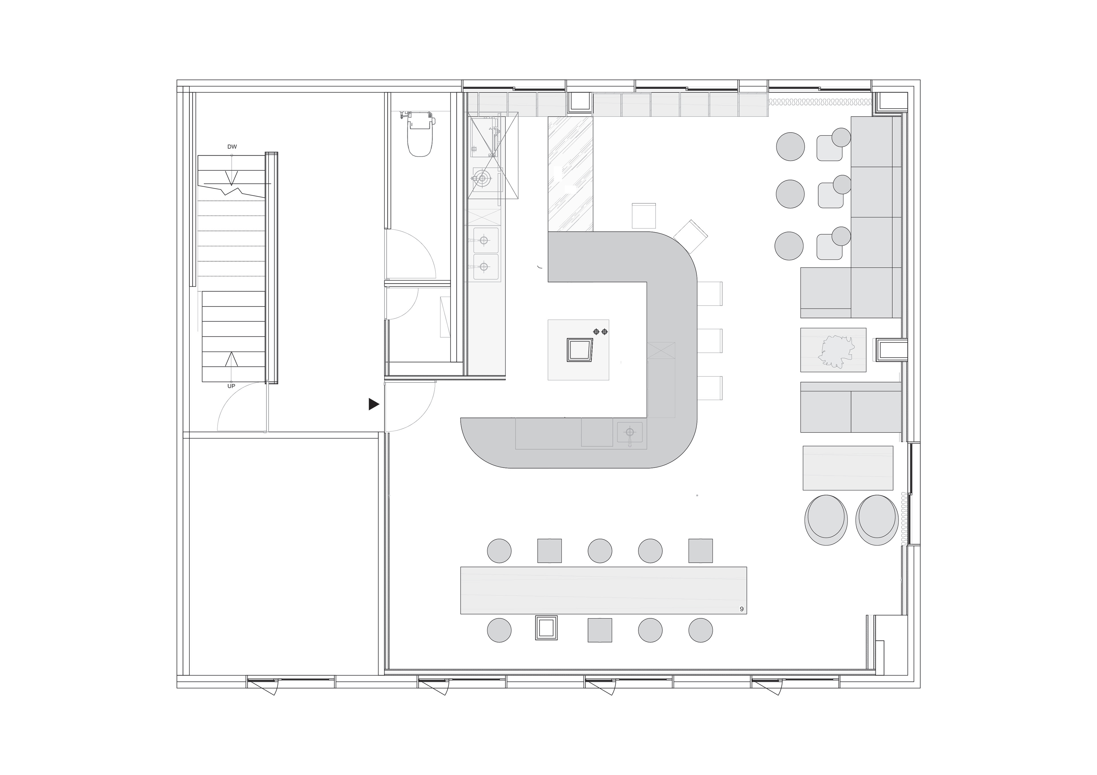 Interior design plan for a café and shisha bar. A structural column standing neither at the center nor at the edge of the unit was treated as the core, around which a circular counter was arranged, with long tables and box seating unfolding outward. The plan allows the density of relationships to shift according to distance. Translucent curtains and low color-temperature lighting create a subtle fluctuation at the center, establishing a clear spatial gravity. By enabling staff to operate from this core, behavior generates order, allowing the space to self-regulate through structure and human interaction.