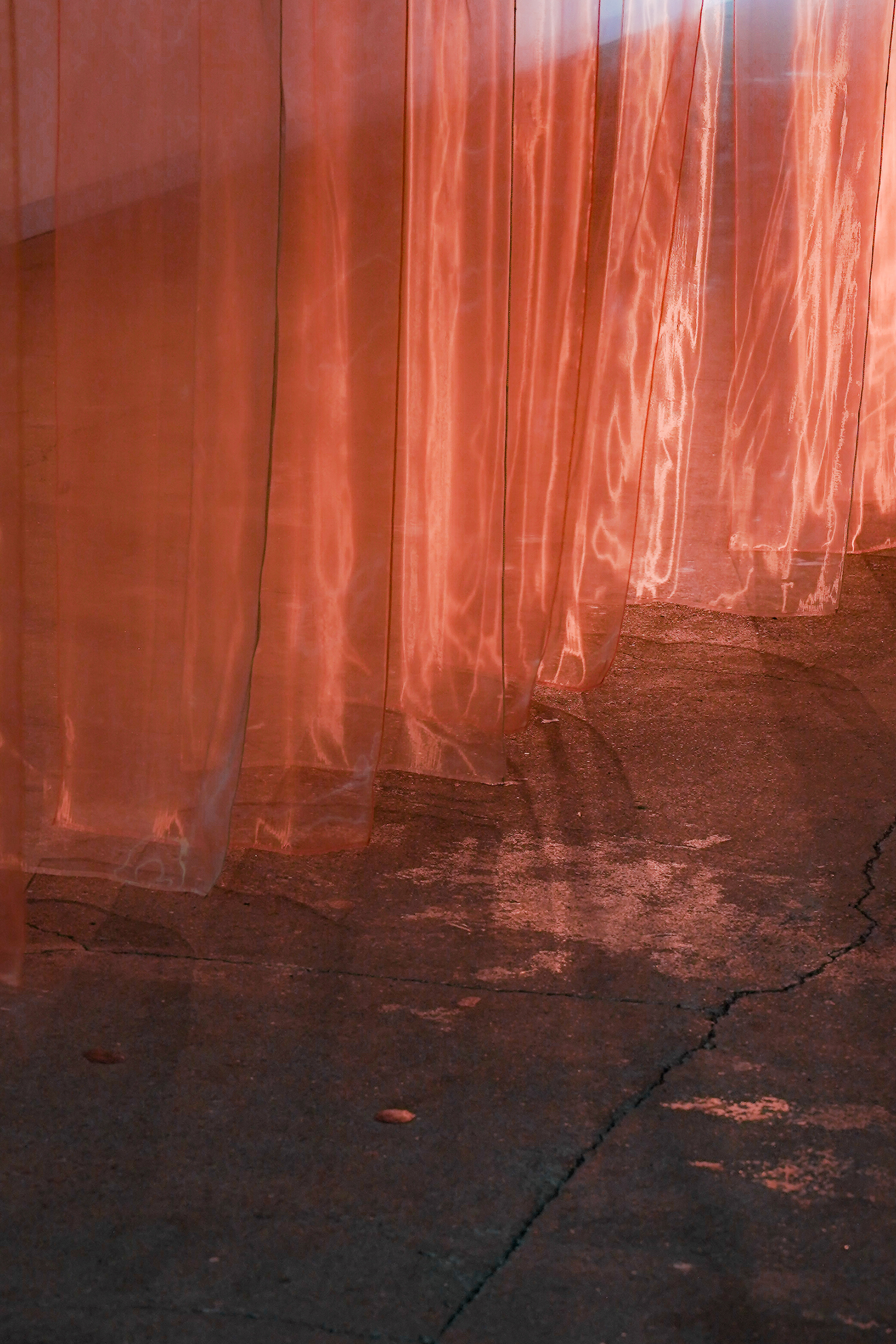 会場のエントランスは、訪れる人を迎え入れる体験そのものをデザインした。遠くからは、イベントカラーであるオレンジの布が連なり、時折そのあいだから光が走る。それは近づくと、周囲に響く笑い声や足音に呼応して光が揺らぎ、自らの存在が空間に作用していることに気づく。さらに一歩踏み出せば、布がふわりと揺れ、足音とともに光が動き出し、まるで空間そのものが来場者を歓迎しているかのような感覚を生む。布の回廊を抜けた瞬間、眼前には賑わうマーケットが広がり、内と外の境界を越える体験として来場者を引き込む構成とした。