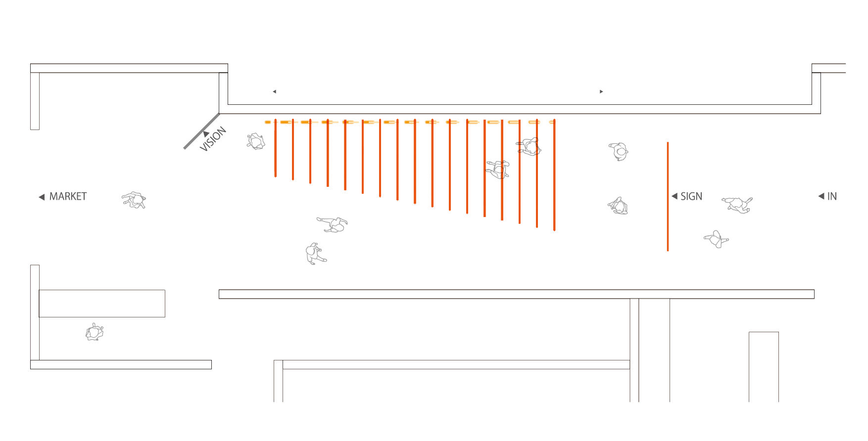 会場のエントランスは、訪れる人を迎え入れる体験そのものをデザインした。遠くからは、イベントカラーであるオレンジの布が連なり、時折そのあいだから光が走る。それは近づくと、周囲に響く笑い声や足音に呼応して光が揺らぎ、自らの存在が空間に作用していることに気づく。さらに一歩踏み出せば、布がふわりと揺れ、足音とともに光が動き出し、まるで空間そのものが来場者を歓迎しているかのような感覚を生む。布の回廊を抜けた瞬間、眼前には賑わうマーケットが広がり、内と外の境界を越える体験として来場者を引き込む構成とした。