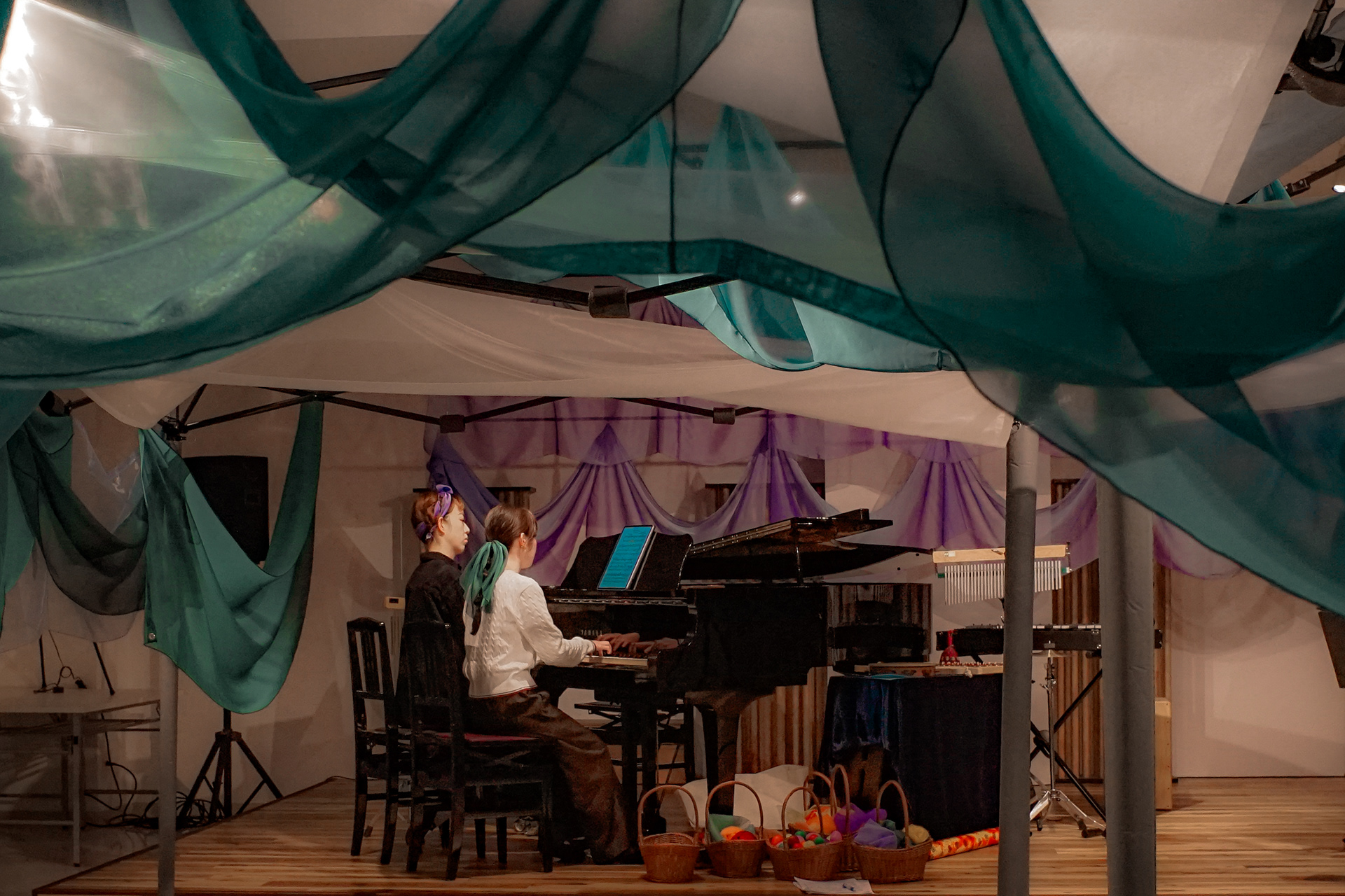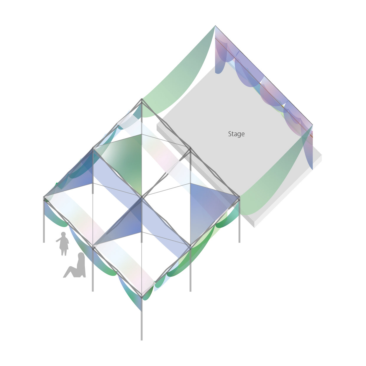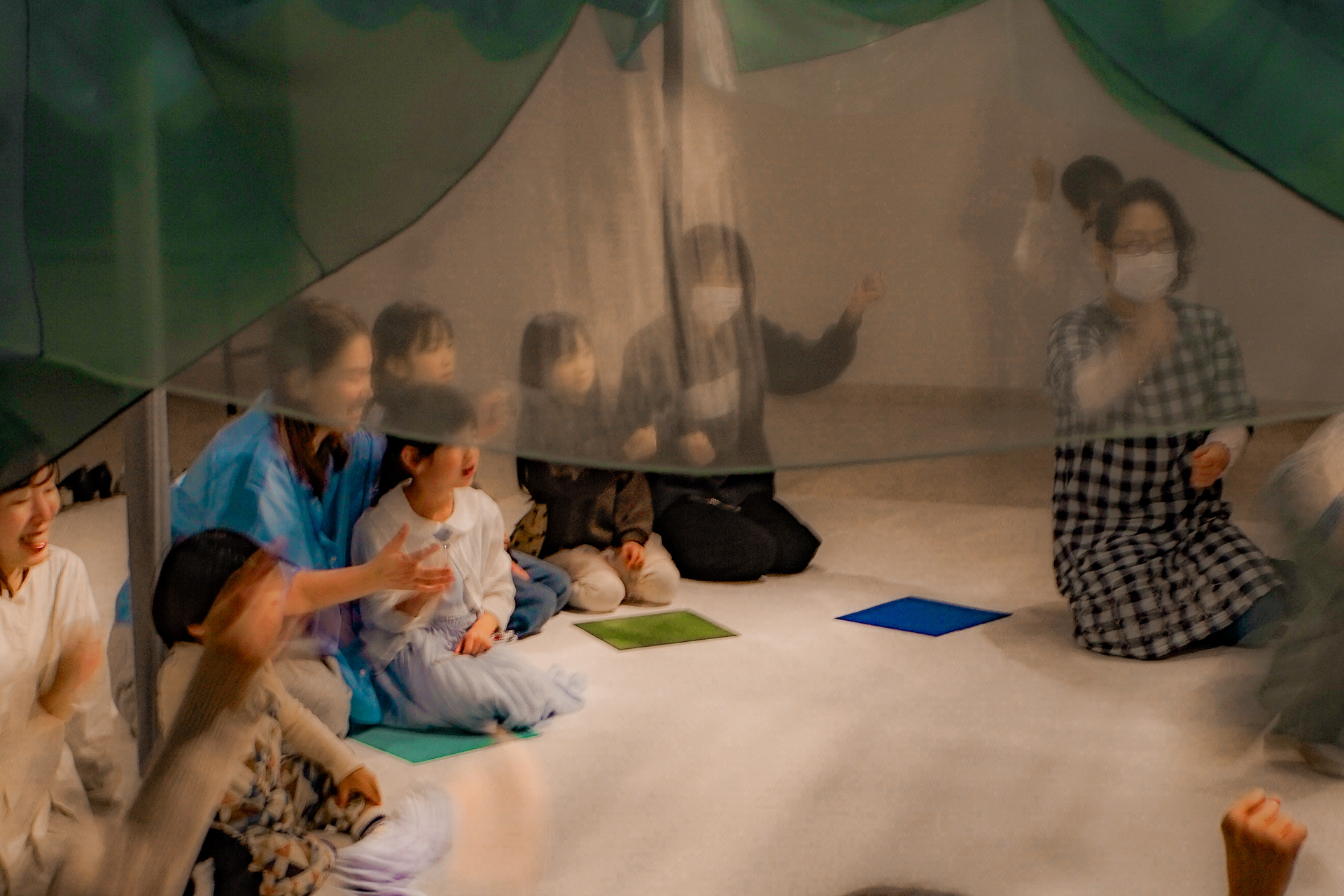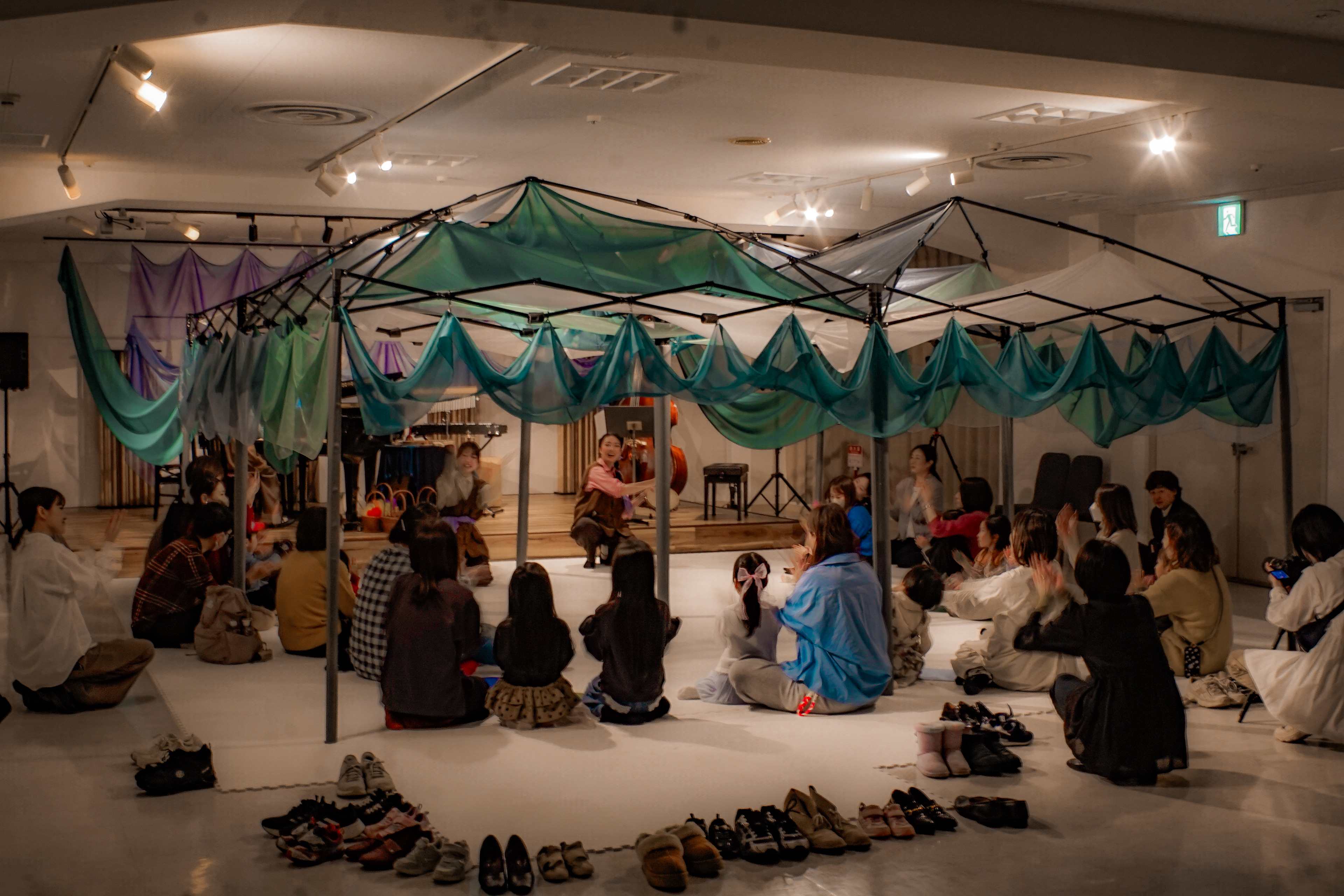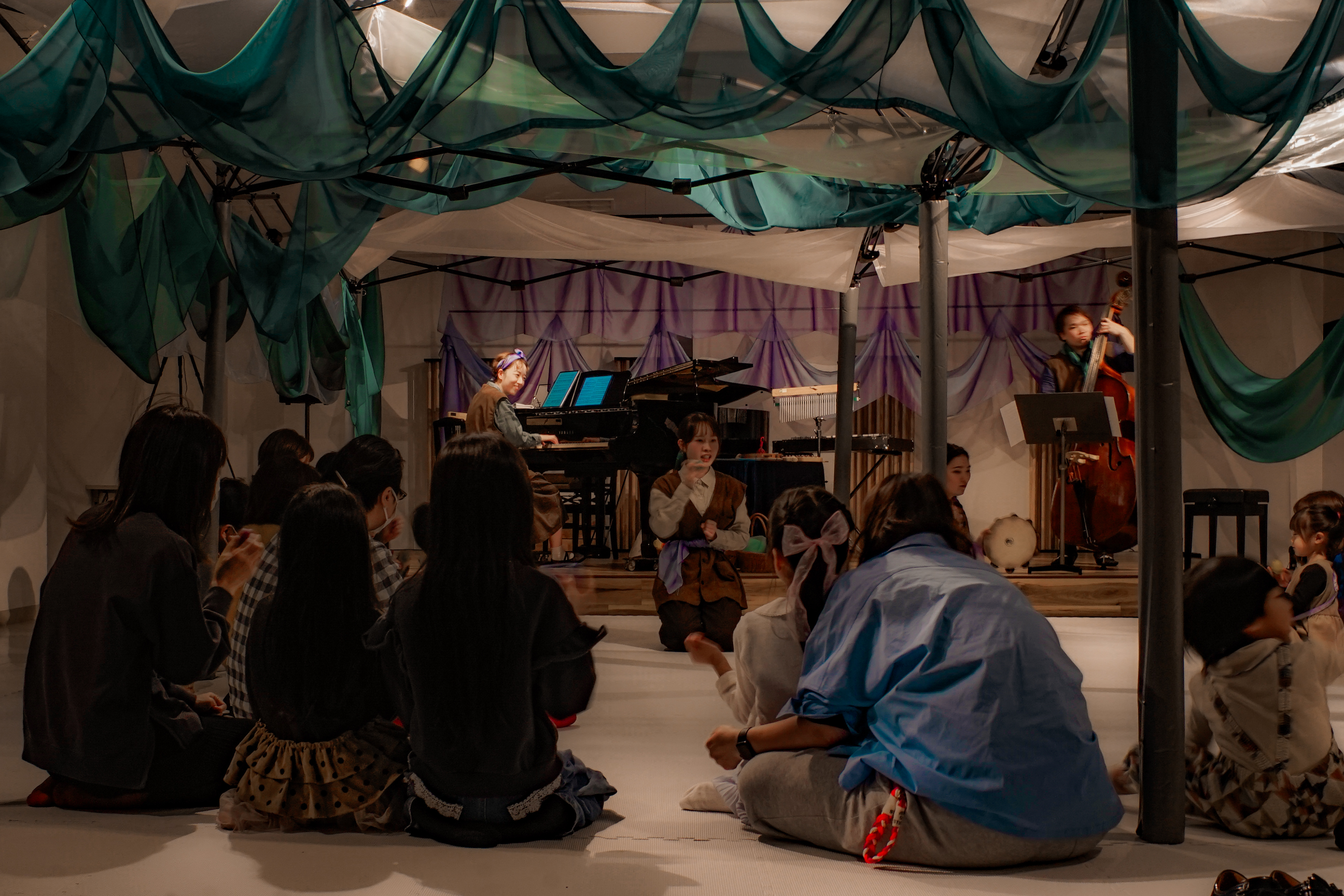 親子で楽しめる没入型の音楽体験を、布という柔らかな素材を用いて、音楽と空間の関係性を編み替えた。都市に残る自然の記憶と、こどもたちの感覚に宿るノスタルジアを重ね、有機的な曲線と軽やかなドレープによって空間を立ち上げる。登ることはできないが高低差を感じる構成や、くぐりたくなるゲート状の布の配置が、身体の動きと視線を導き、体験にリズムと広がりを生む。子供たちは舞台と客席の境界を意識せず、演者の動きや音に対して身体で応答し、場全体が一体となって機能するコンサートとなった。